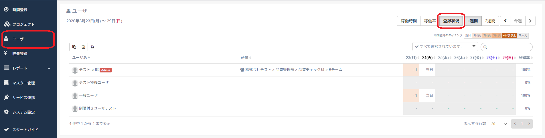 それぞれのユーザがいつ時間登録を行ったのかを確認します。